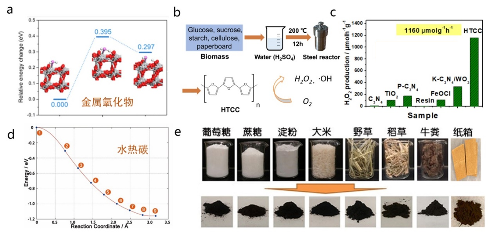 通过水热法可将存量巨大、可再生、成本低廉的生物质废料转化成水热碳,在太阳光照下产生光生电子还原氧气产生双氧水,产率高达1160 μmol gcat-1 h-1。氧的活化没有明显能量垫垒,有利于氧气的活化(Environ. Sci. Technol., 2017, 51, 7076)(ACS Catal., 2021, 11, 14480)。利用含铜废水与生物质制备了纳米铜-水热碳,在无光无电下也能高效活化氧气产生羟基自由基与双氧水(Appl. Catal. B: Environ., 2022, 319, 121918)。在宽pH范围内高效降解硝基苯、苯酚、布洛芬、双酚A等污染物。相关技术获授权专利5项(ZL202010055787.7,ZL202010055779.2,ZL202010879855.1,ZL202010880987.6,ZL202110757870.3)。