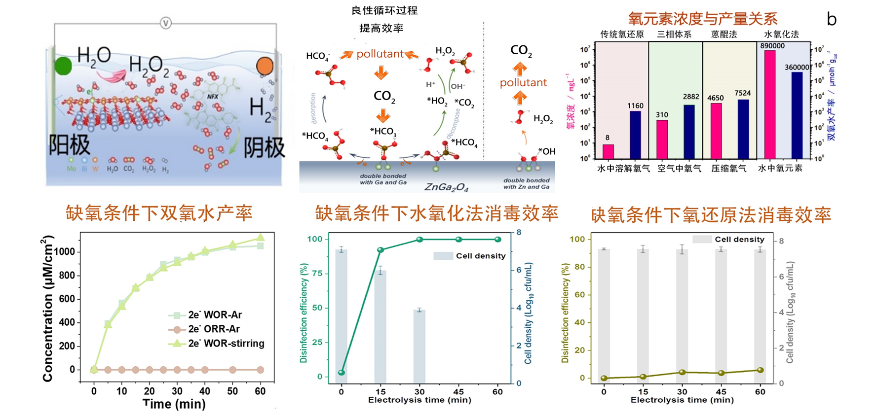提出新型水氧化技术,把水分子中的氧元素氧化成双氧水(2H2O=H2O2+H2),充分保证氧元素供给,突破氧气含量的局限性。我们在钨酸盐上实现了高效二电子电催化氧化水产双氧水降解抗生素,产率高达360000 μmol gcat−1 h−1。目前该方法制备的双氧水价格低至0.14元/mol,远低于工业法制备的0.8元/mol(工业大桶装)和10元/mol(日常便捷装)。相关研究成果发表在国际顶级化学期刊Angewandte Chemie International Edition(2020, 59, 20538)和Nature Communications(2023, 14 , 1890.)上。进一步,发现了一种全新的不依赖水中OH的二电子反应机制,在碳式碳酸铜(Cu2(OH)2CO3)催化剂上,利用晶格”OH”做为媒介实现二电子水氧化反应,指出其与水中其它阴离子相互作用来参与到水氧化过程中产生双氧水。相关研究被Nature Communications(2024, 15, 10456)接收。